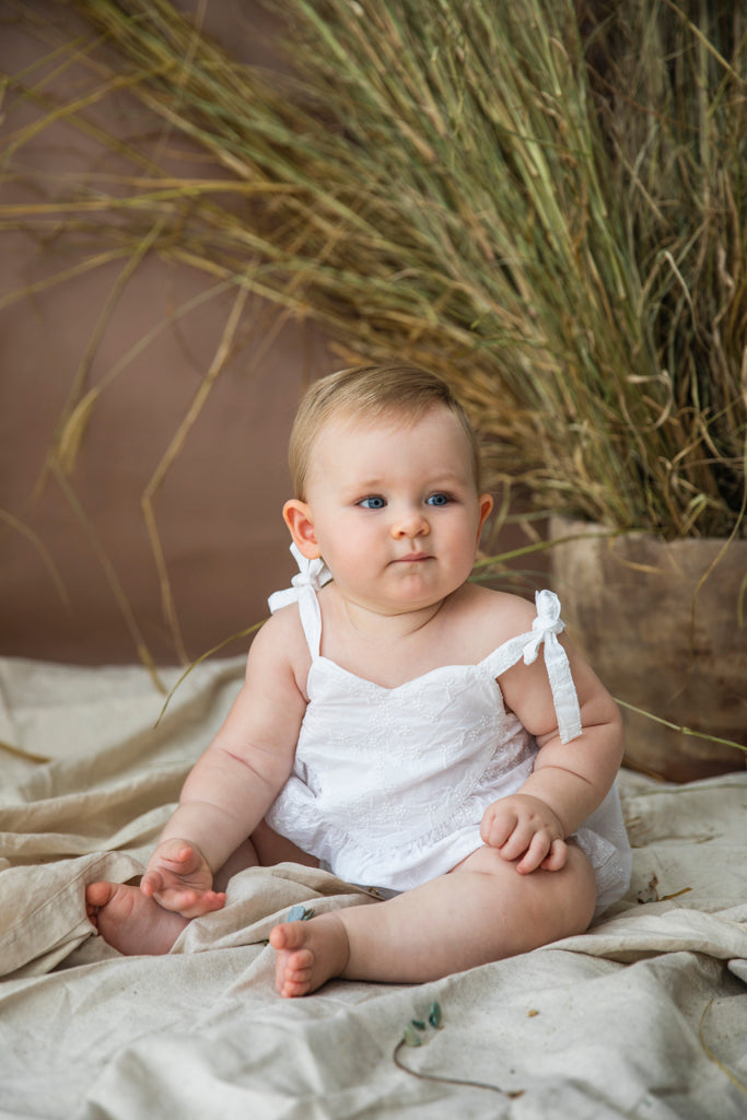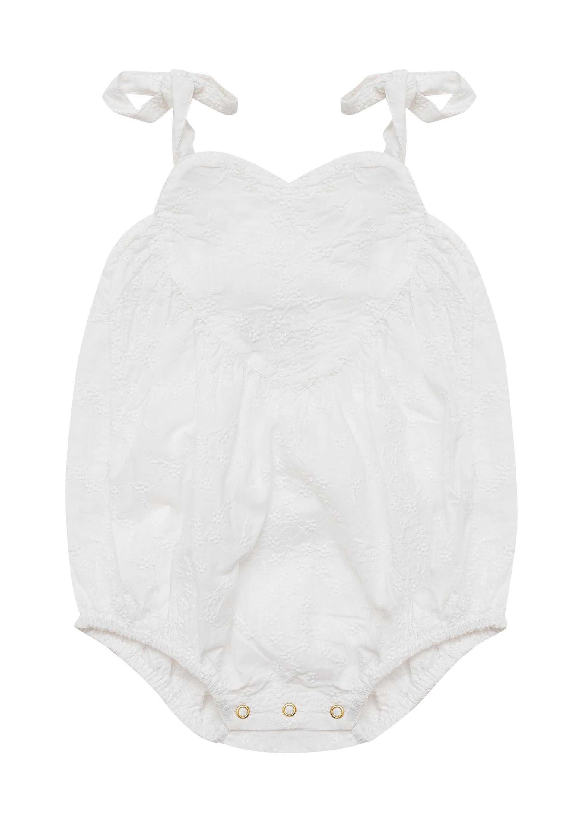 This romper is classic with a darling twist.  Keep your sweet little love cool and comfortable in tie shoulder straps, sweet heart front panel and gold snaps for easy nappy changes. Made from all over embroidered cotton