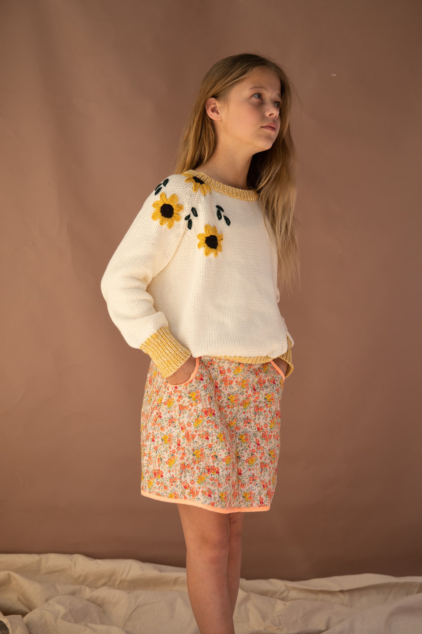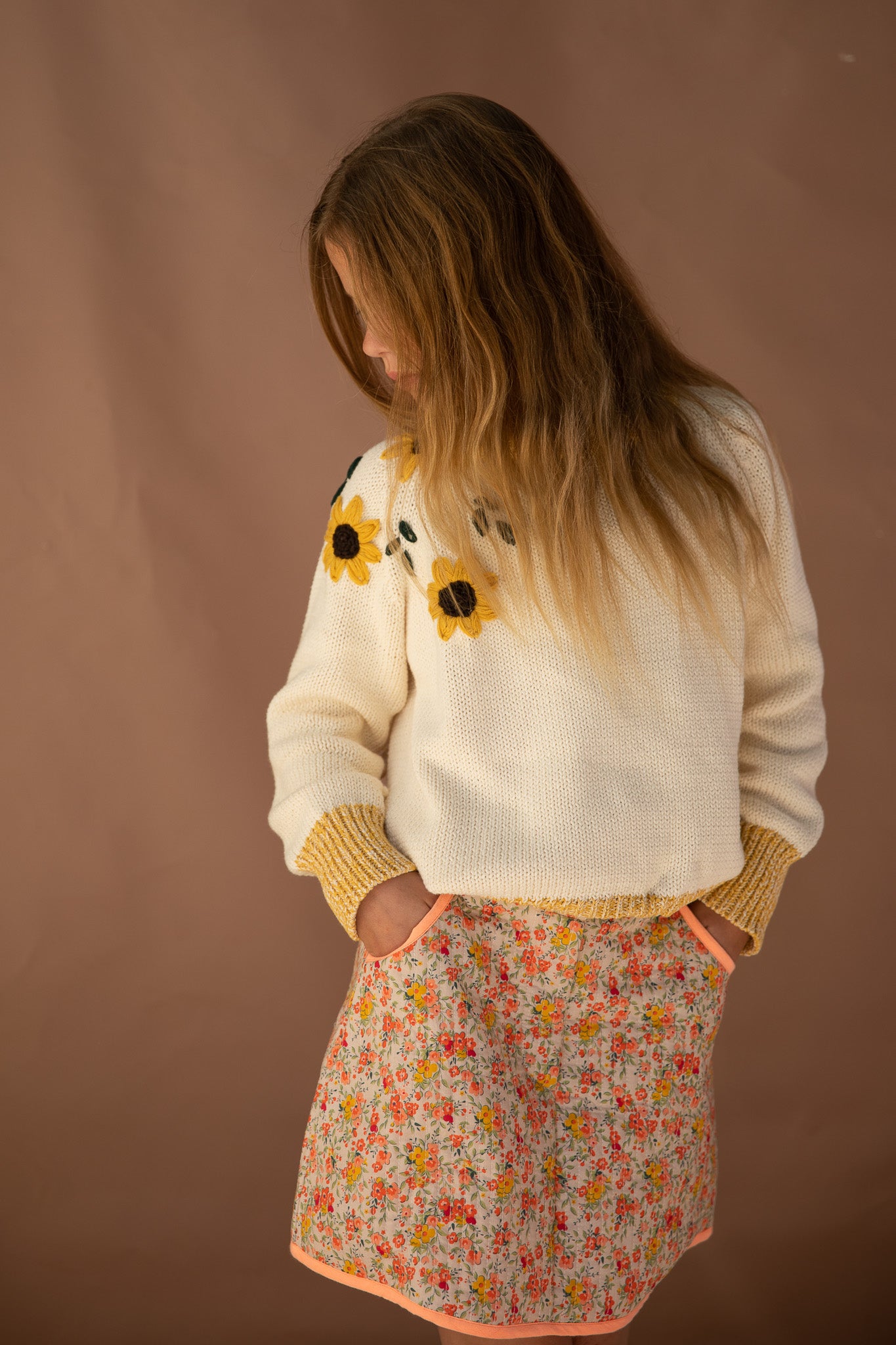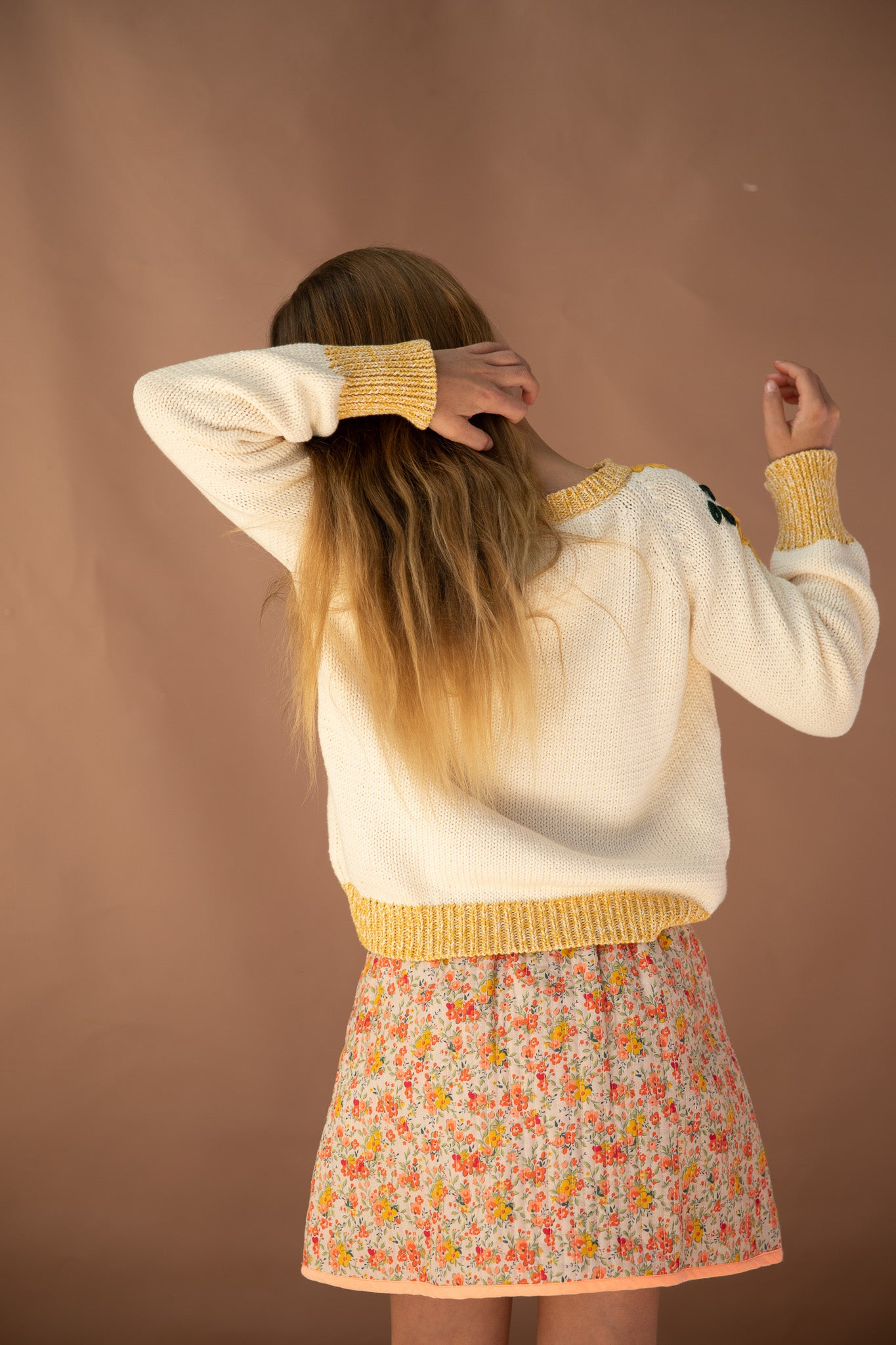 The ultimate cozy cream cotton knit finished with mustard marl cuffs and collar.   Buttery soft and snug, with sunshine yellow flower embroidery to keep you smiling right through the cooler months. Wear back with Ronin Skirt for a sweet and pretty look, or pair with “Stevie” trackies for marshmallows and movie night comfort.