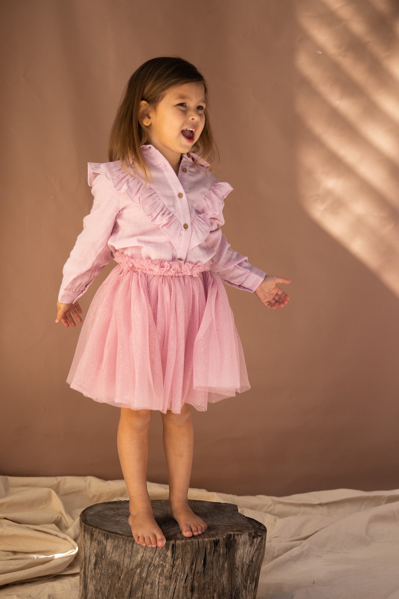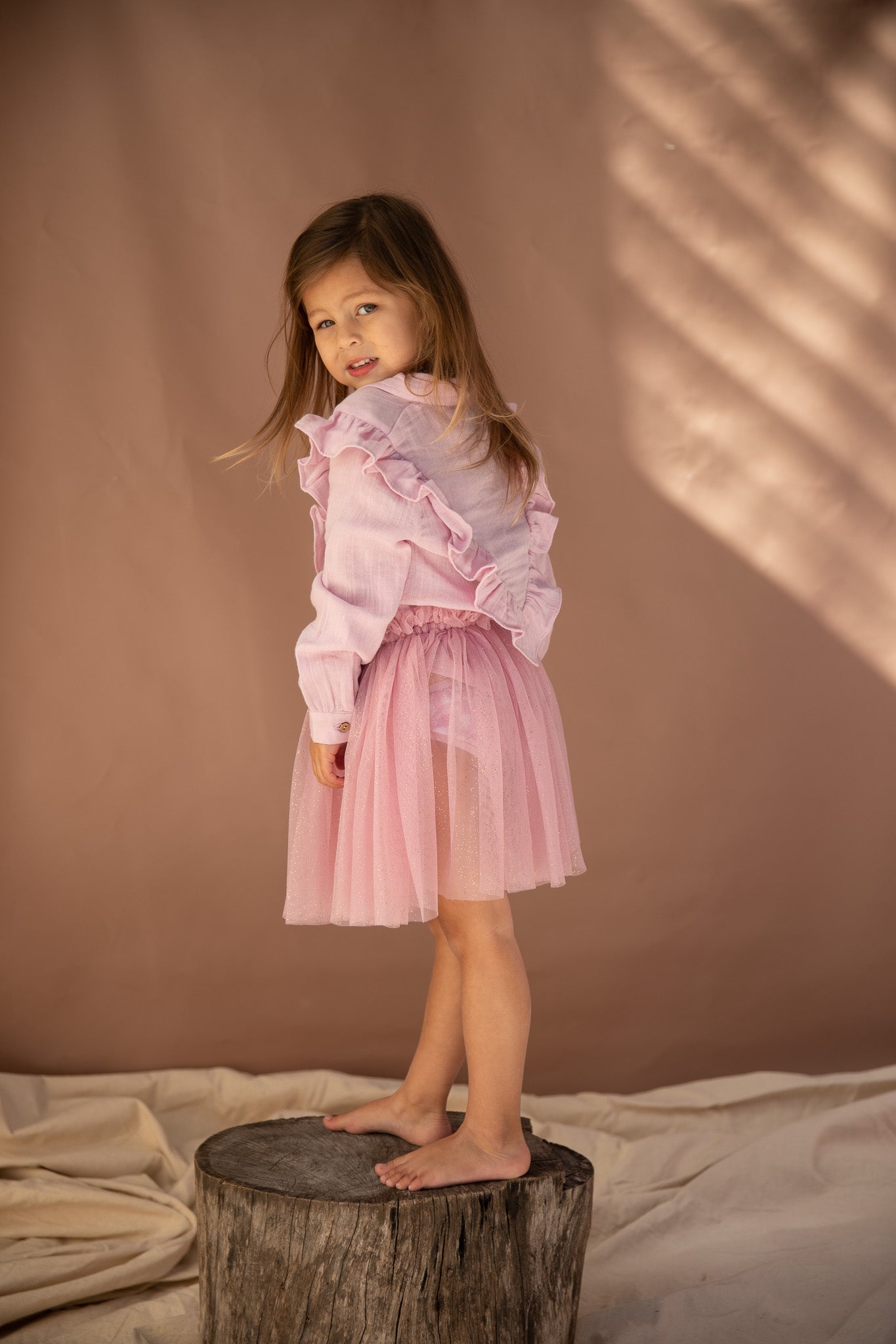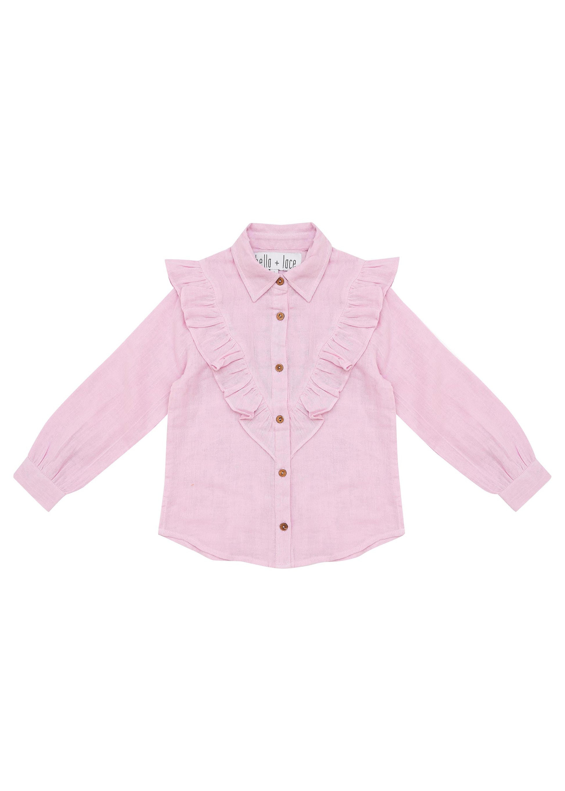 The softest Double gauze shirt with a little nod to Nashville. Dolly has a fun ruffle front, cuffed sleeve detail and sweet wooden buttons made of 100% Cotton Gauze.