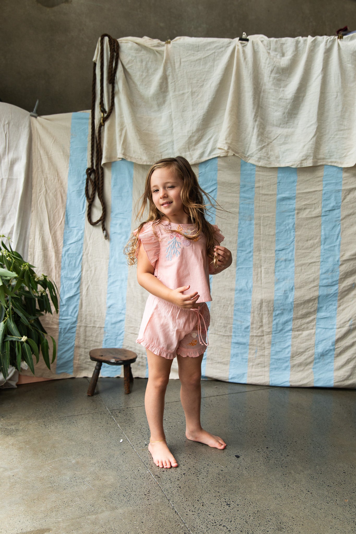 Gia shorts are your go-to easy-wear option, with a comfy stretchy waistband and a sweet ruffle hem. Playful ties and pretty embroidery add a fun, unique touch. These are sure to be on high rotation this summer. Made from 100% Cotton.