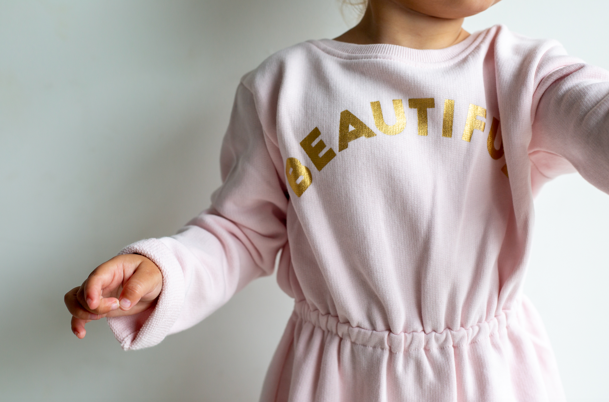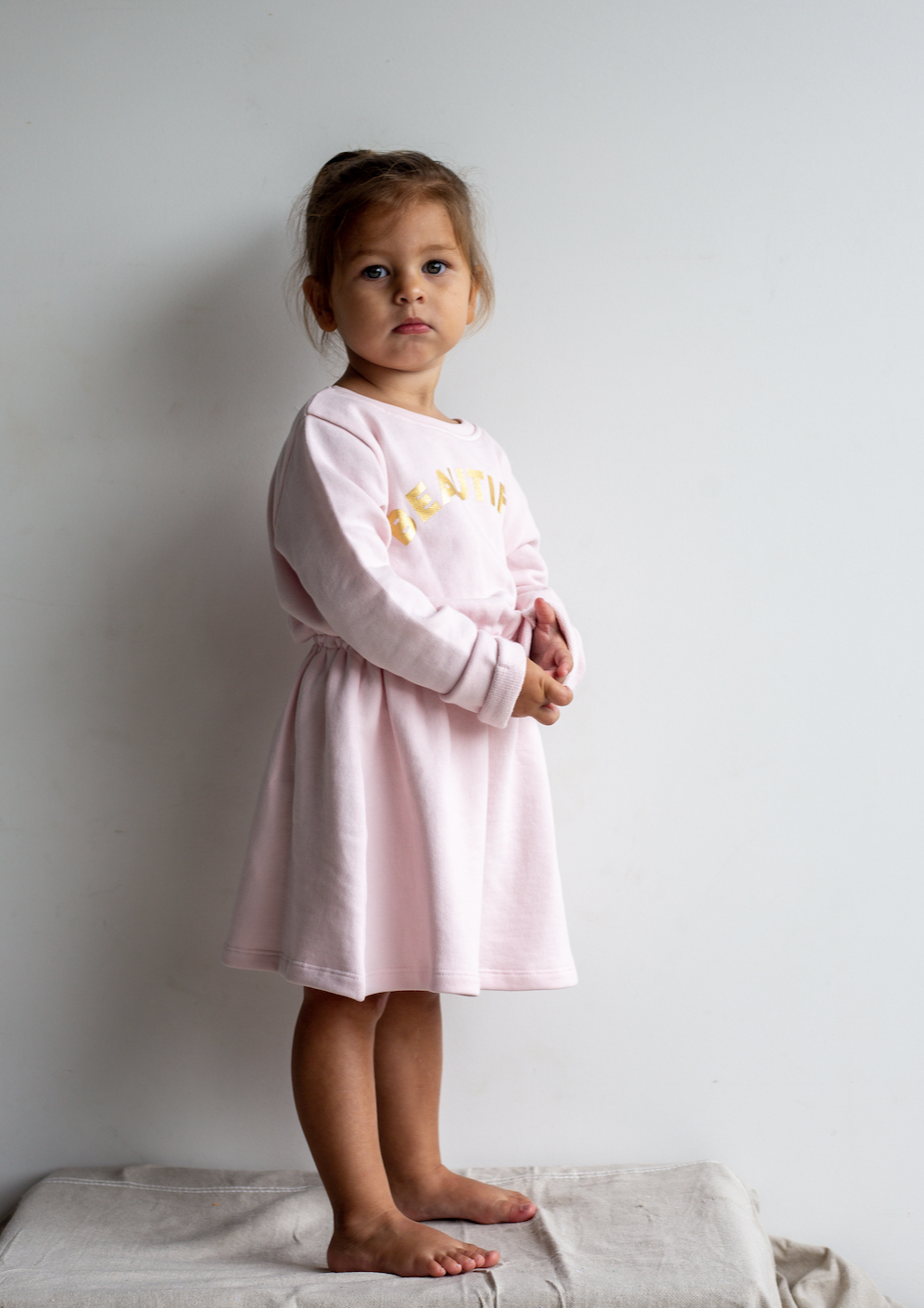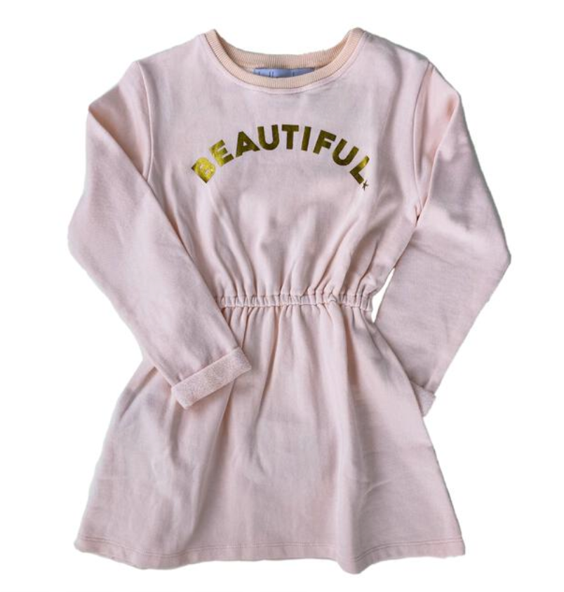 A Super soft and comfortable sweat dress, so easy to throw on over a pair of tights or leggings. It has a ‘beautiful’ logo across the chest, elasticated waist and rib detailing at the neck with a rolled cuff.
