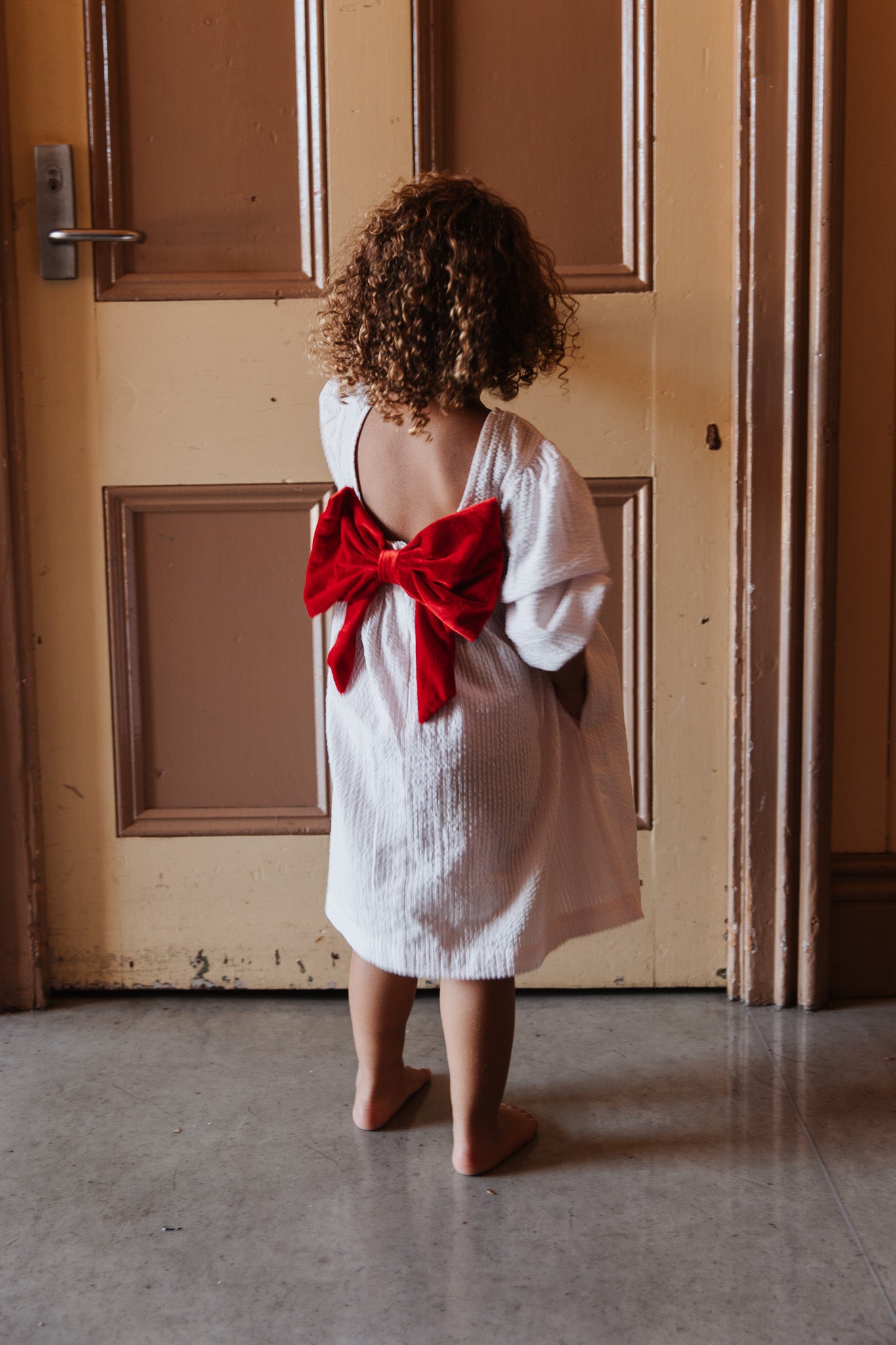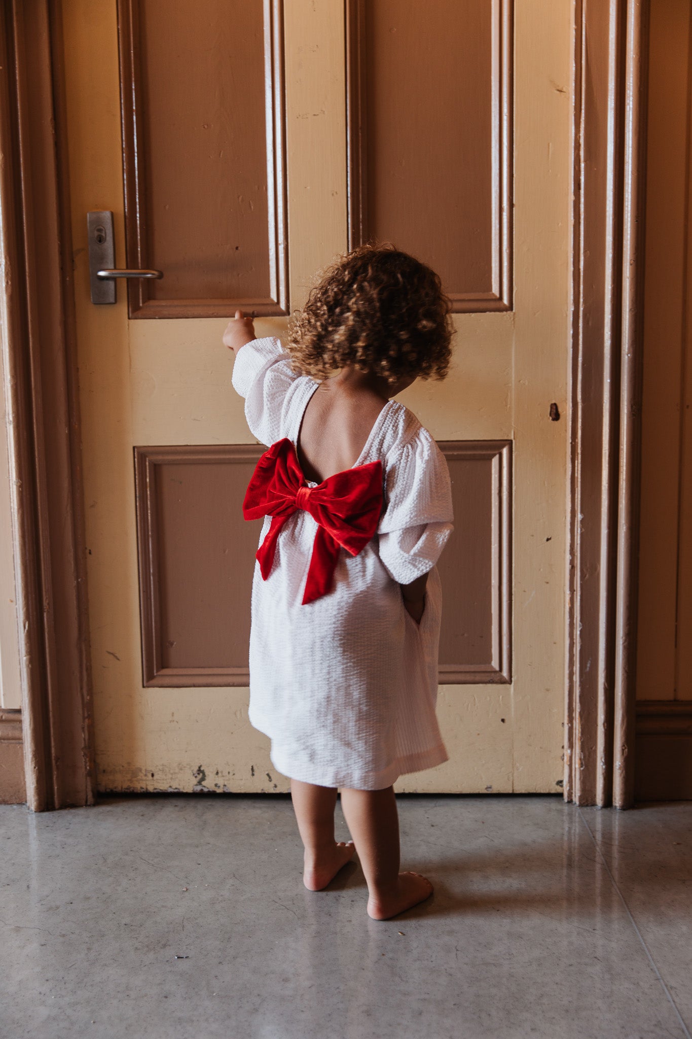 Its breathable fabric ensures all-day comfort, while the playful puff sleeves and big red bow detail on the back adds fashionable fun touch.