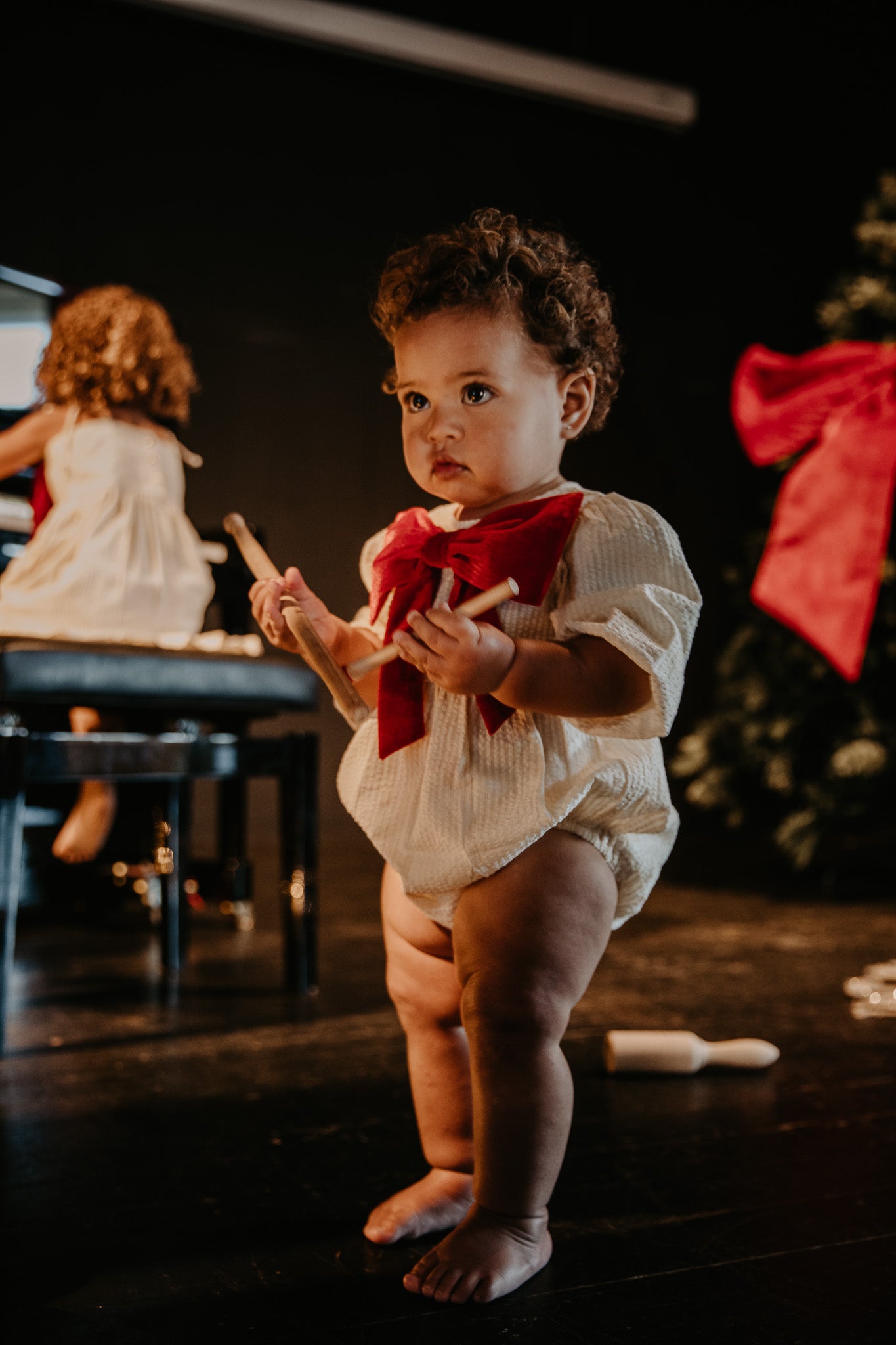 The cutest little romper for Christmas day, photos or anytime of the year. The Pudding romper features our rich red bow with puff sleeve and snap crutch.