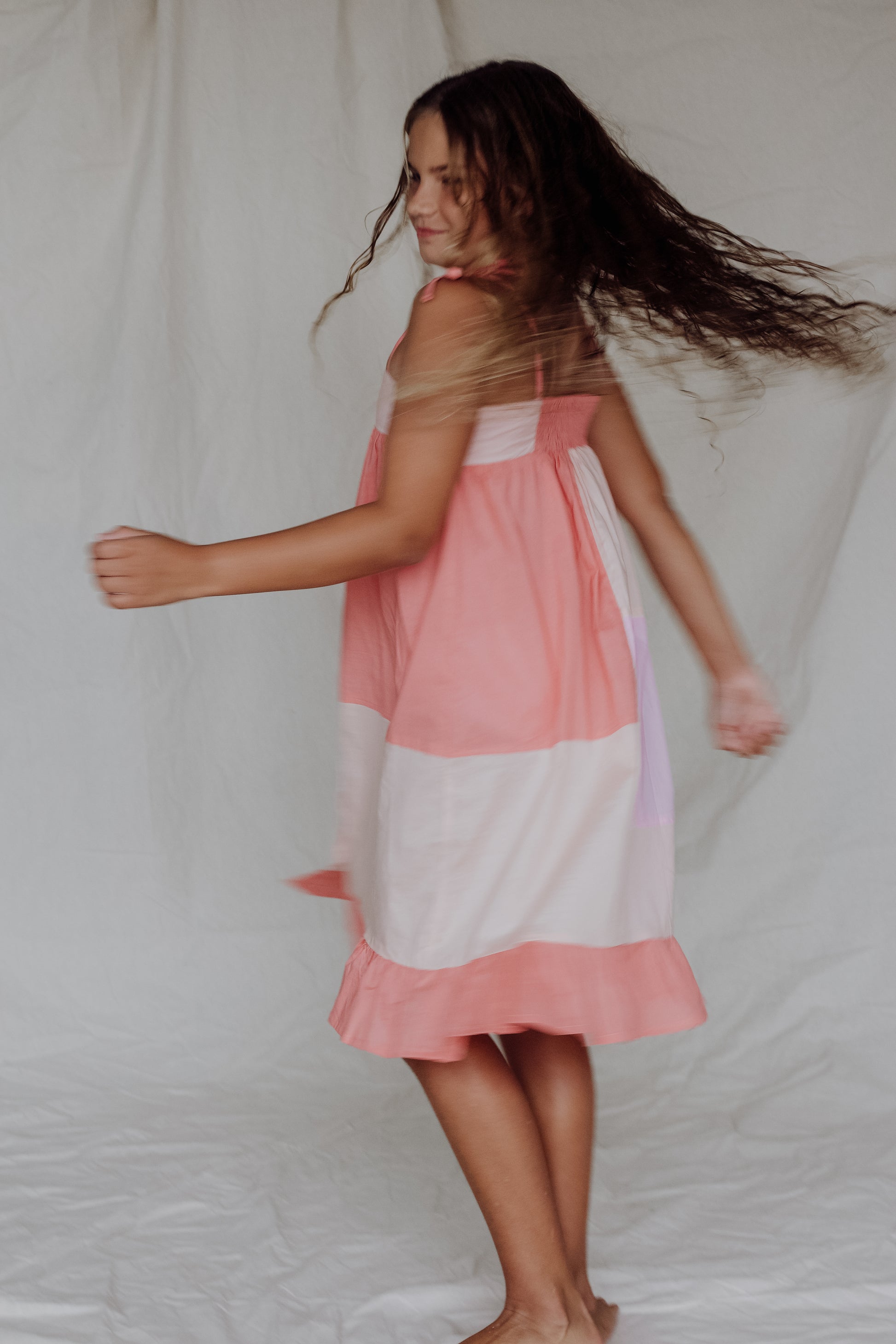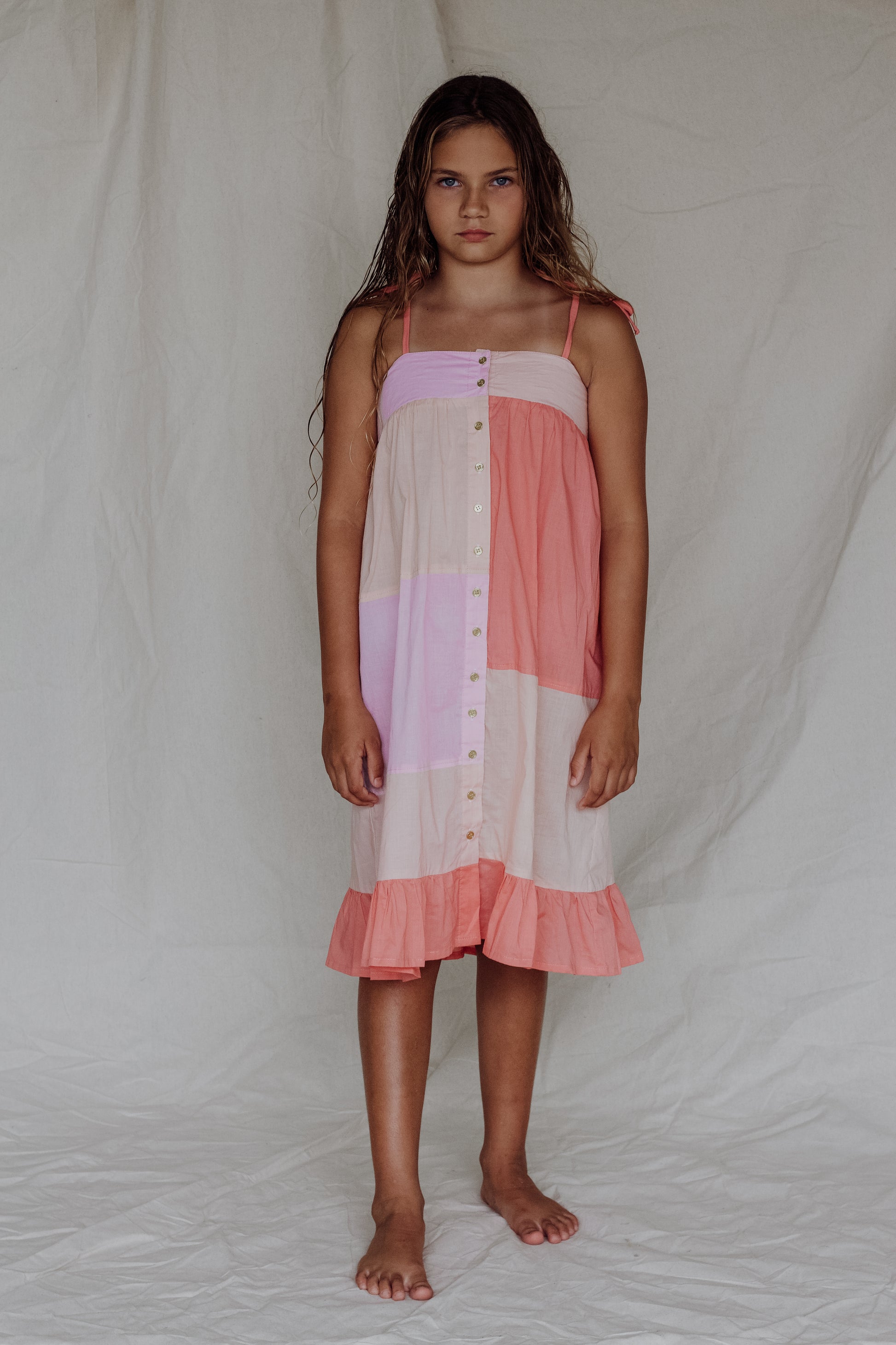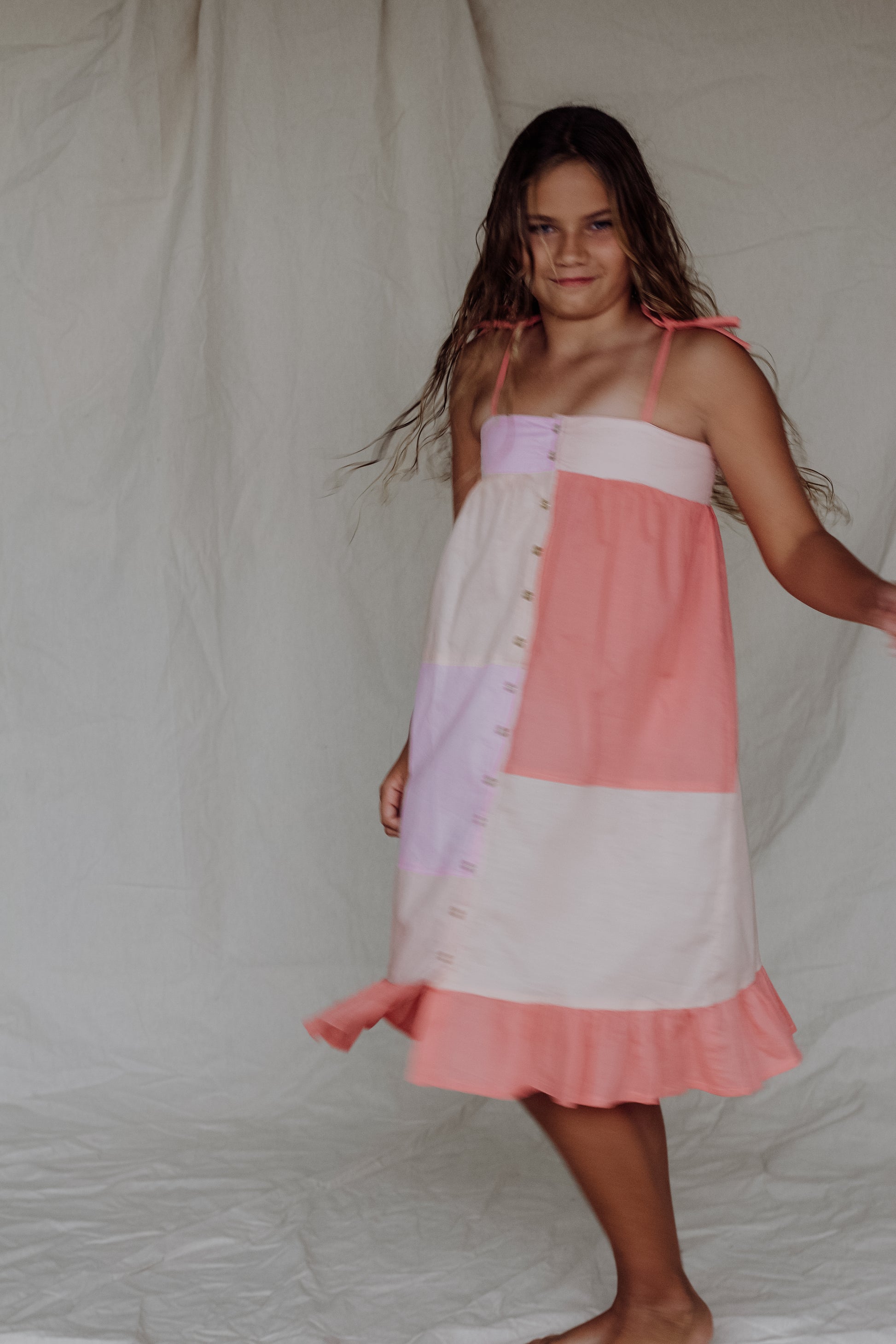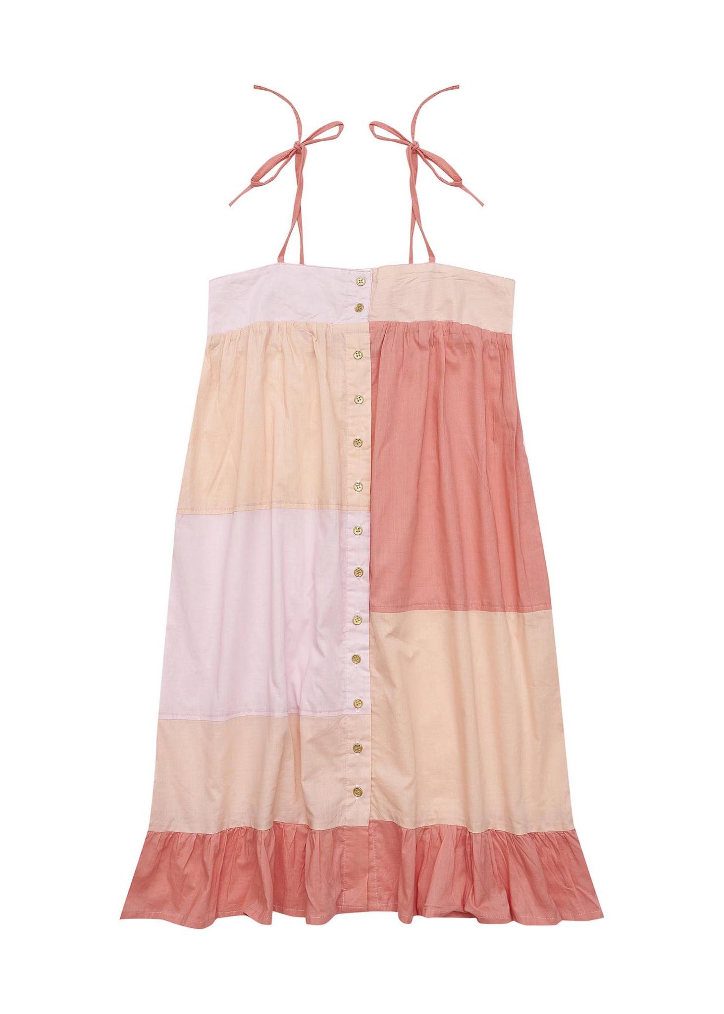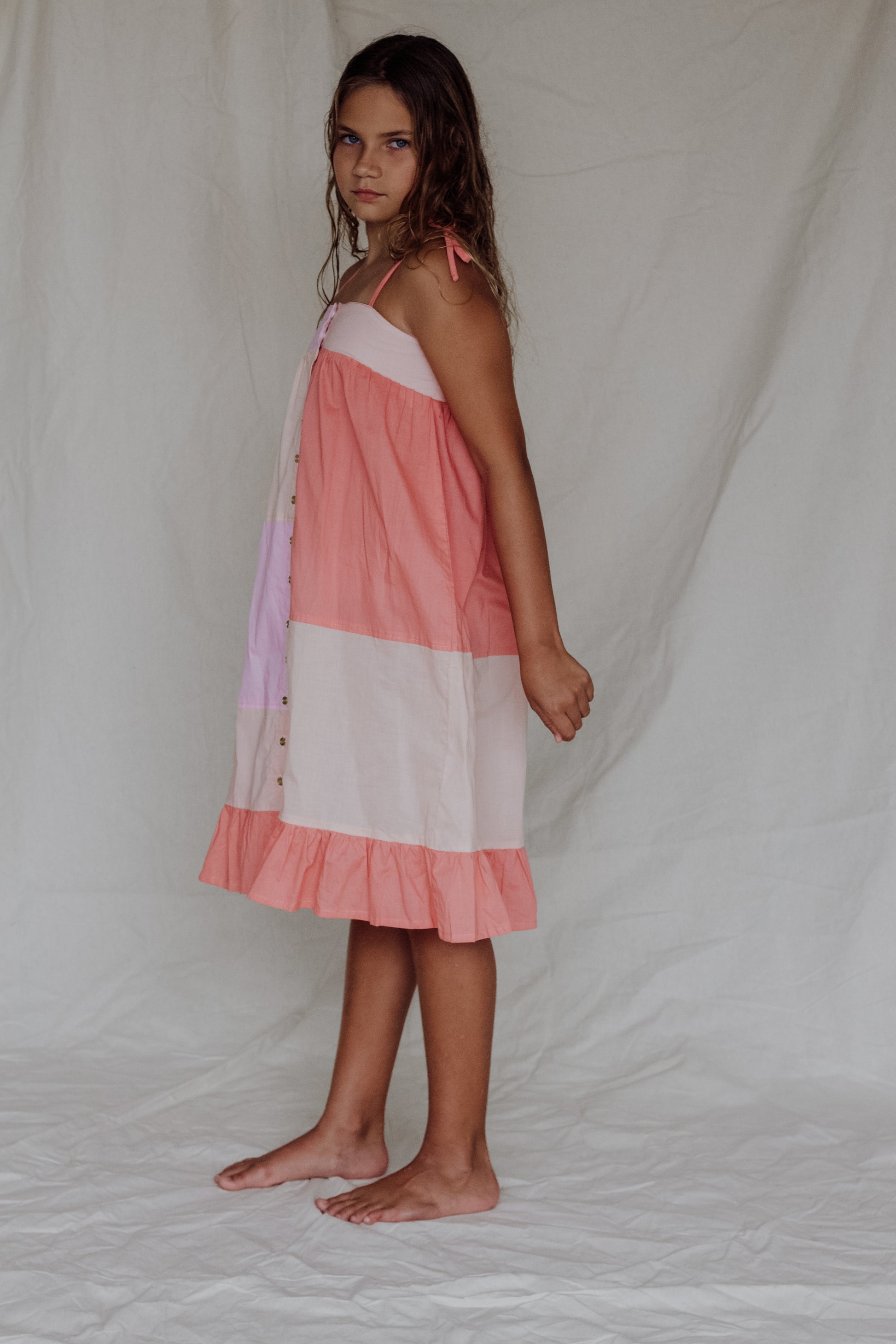 A playful button front in Summer shades of apricot & blush featuring a frill hemline and adjustable tie straps