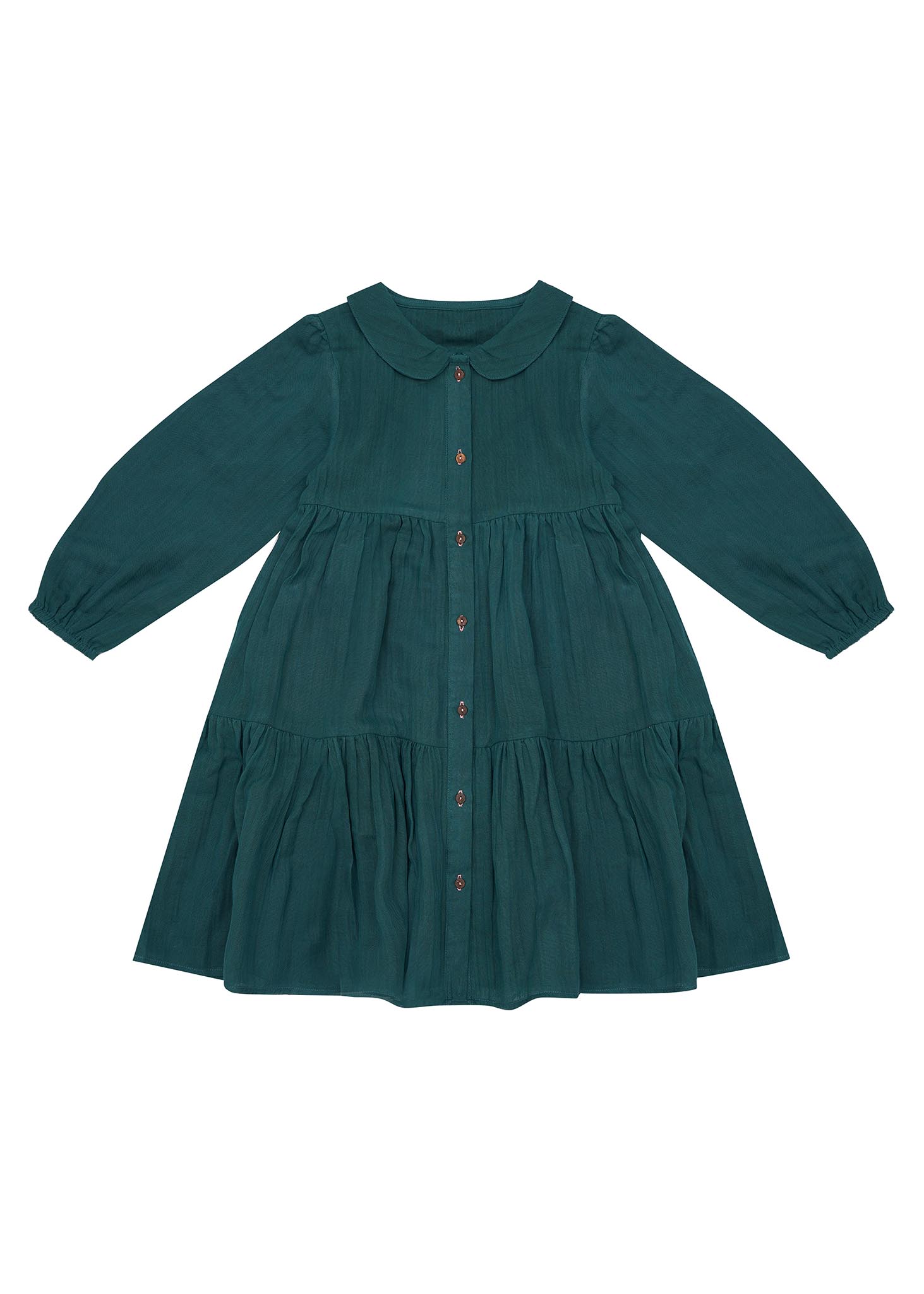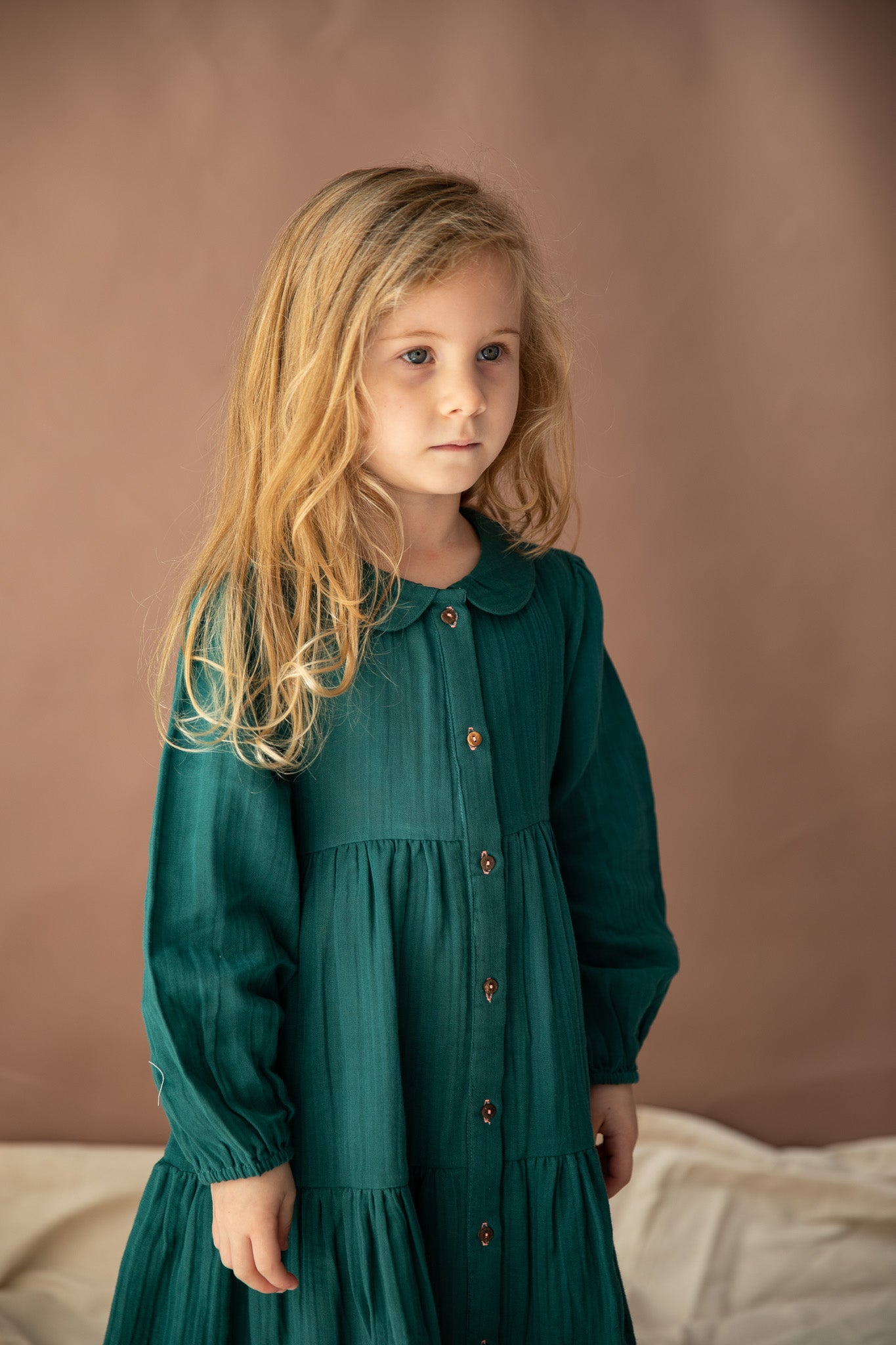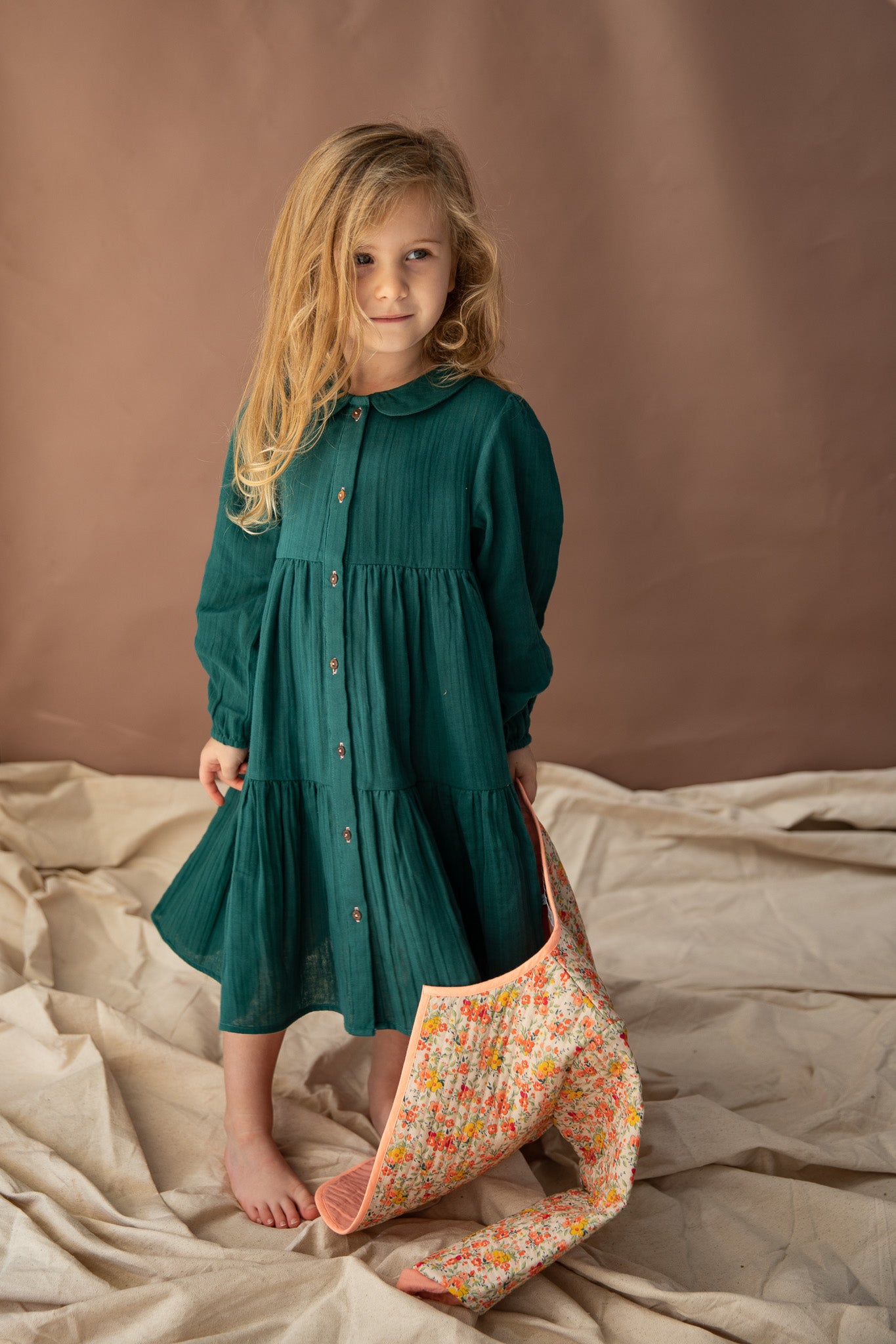 The ideal dress for garden wandering and wildflower gathering.  It’s all in the details, “Sparrow” has a darling Peter Pan collar and tiny wooden buttons sewn with fluro thread. Double gauze is perfect for Layering with knitted leggings and “Minty” knit jumper